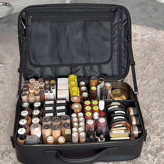 - Large Cosmetic Travel Case - Black Leather - Stylish Travel Makeup Bag Organizer with Dividers