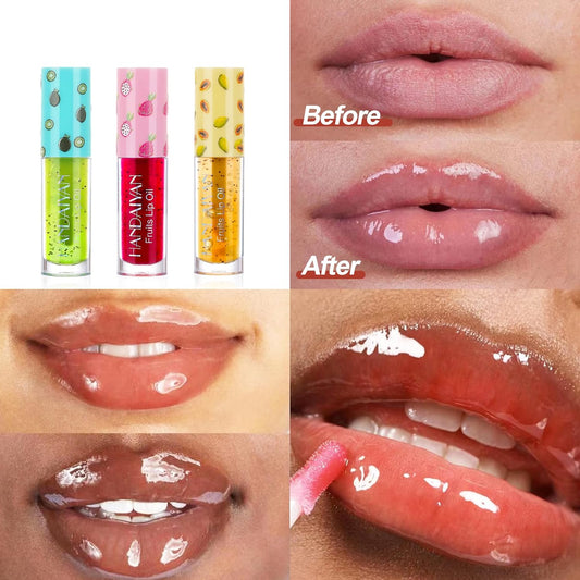 • 3Pcs Fruit Lip Oil, Hydrating Lip Glow Oil Plumping Glass Finish Moisturizing Lip Gloss Lip Tint Fruit Extract Lip Oil Tinted for Dry Lip and Lip Care
